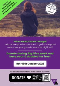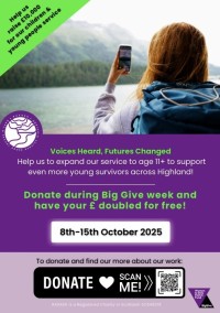This year, we’re thrilled to be part of The Big Give, the UK’s largest match funding campaign. For a limited time, every donation you make to our ‘Voices Heard, Futures Changed‘ campaign through The Big Give will be matched £ for £. That means your impact is doubled! Together, we can make an even bigger difference in the lives of young survivors across Highland.